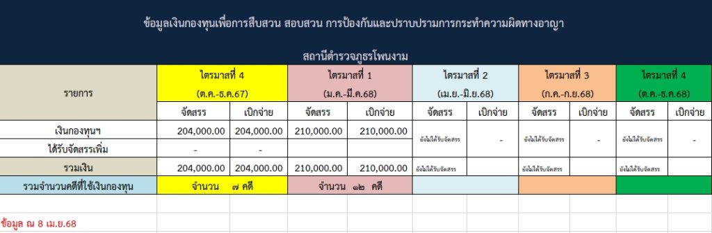 ข้อมูลเงินกองทุนเพื่อการสืบสวนและสอบสวน การป้องกันและปราบปรามการกระทำผิดทางอาญา ประจำปีงบประมาณ พ.ศ.2568  สภ.โพนงาม